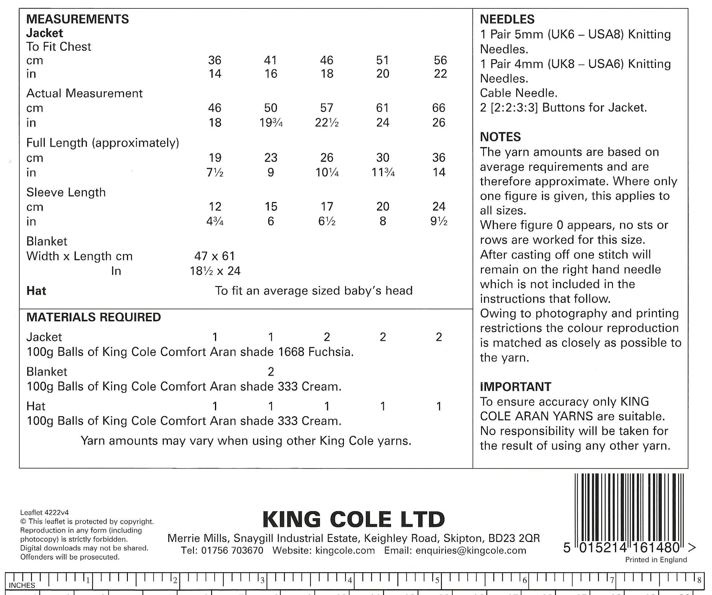 This leaflet pattern will instruct you on how to make a baby jacket, hat and blanket that are suitable for chest measurements 36 - 56 cm / 14 - 22 inches