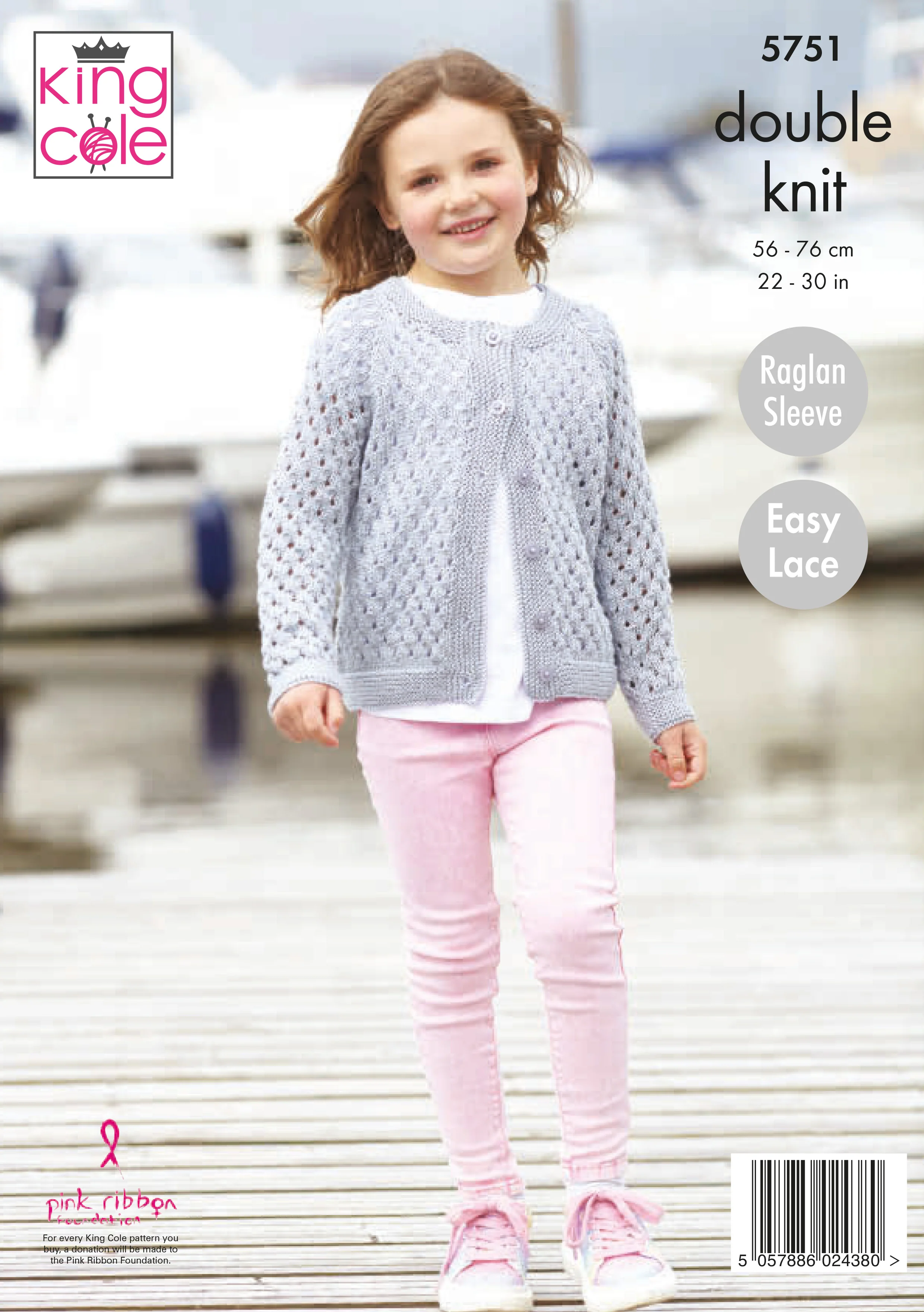 King Cole 5751 DK Knitting Pattern - Easy Lace Girls Sweater & Cardigan (22-30in)