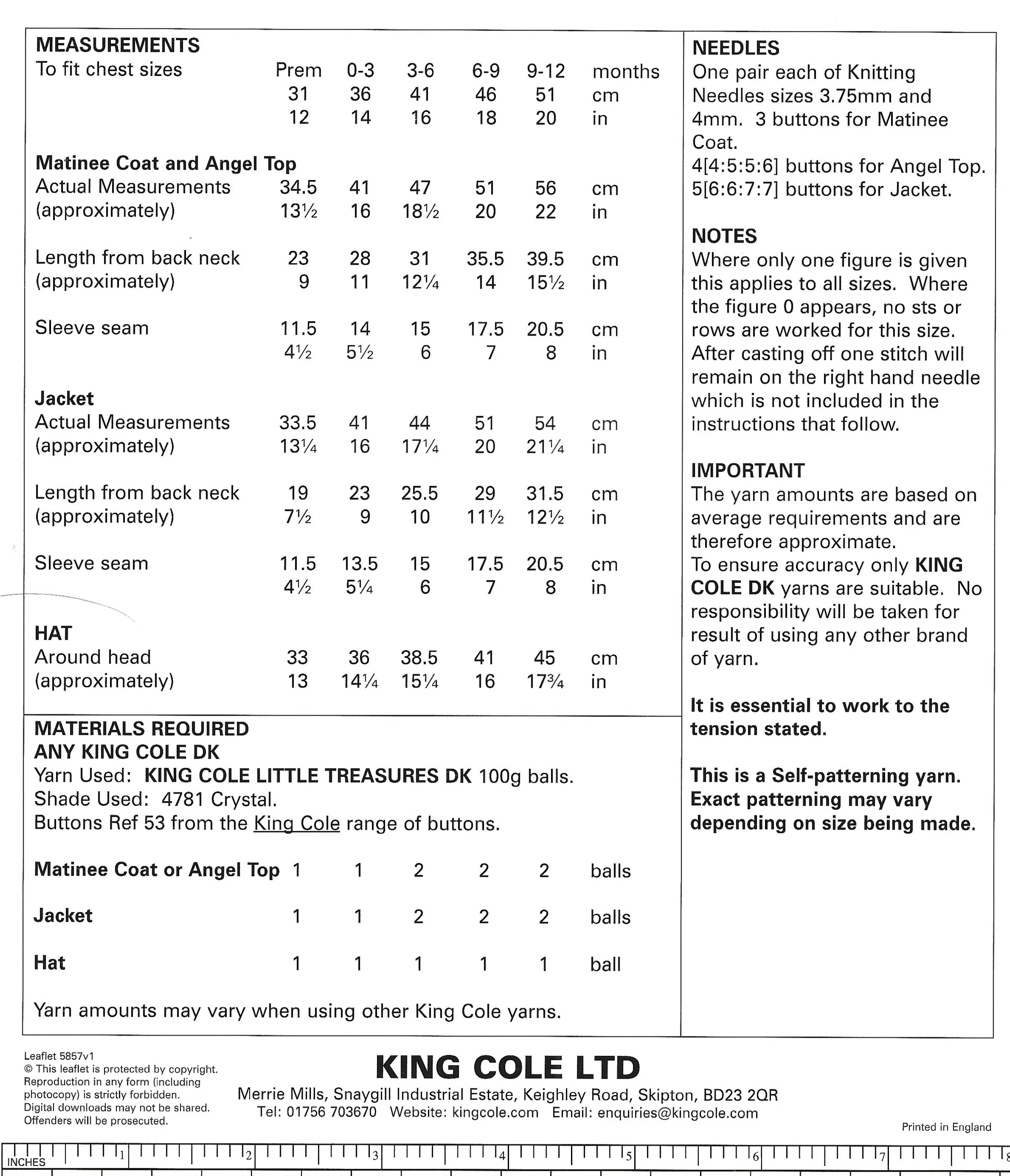 King Cole 5857 Baby DK Knitting Pattern - Matinee Coat or Angel Top, Jacket & Hat (Prem-12mnth)