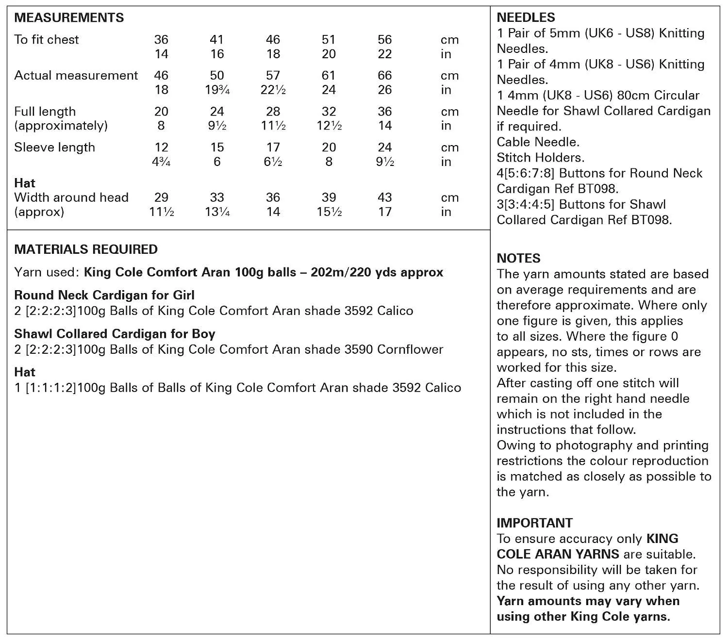 This leaflet pattern will instruct you on how to make a Round Neck Cardigan for Girls, Shawl Collared Cardigans for Boys and a Hat for babies with chest measurements 36 - 56 cm / 14 - 22 inches